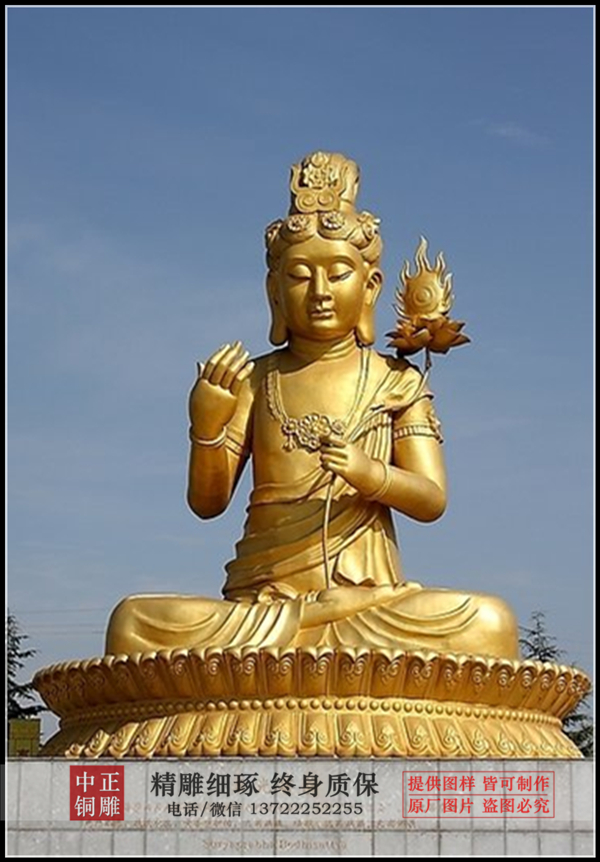 在铜佛像厂家生产的日光菩萨与月光菩萨形象有很多种,日光菩萨为通身赤红色,坐赤莲上,左手持赤莲,右手半举朝内结印,莲上安日轮。月光菩萨为童子形,坐赤莲上,黄色装,右手执上安半月之细叶青莲,左手持未敷莲花。