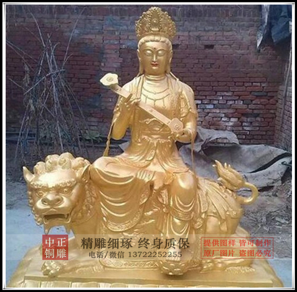 文殊菩萨以大智慧为本愿,以智慧著称。文殊菩萨在过去世曾身为七佛之师,连释迦牟尼佛也曾得到过他的教诲,其 智慧的深广锐利,可知矣。在诸大菩萨中,文殊更被冠以"大智"的尊号,文殊菩萨雕塑常是顶结五窑,手持宝剑,表示智慧锐利,最大的特点是骑着一头青狮,表示智慧威猛。