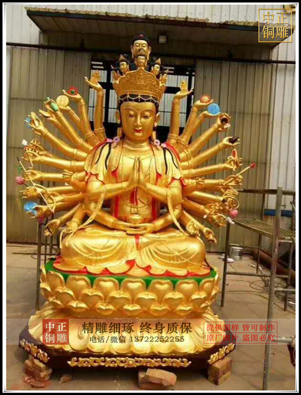 我们常见的千手观音铜像有两种,一种是真塑造了千手千眼观音,每个手掌心中有一只眼,另一种常见是以24只手代表千手,除中央两只手合掌外,左右各有 20只手,每只手代表25只,象征1000只手,手上各有眼睛,分别执各种法器。而通常我们看到的以42只手居多。