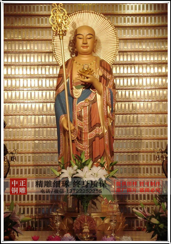 在我国佛教中地藏菩萨铜像作为四大菩萨之一,也是四大菩萨中唯一一位以僧人相示人的菩萨,我国有四大名山,九华山是地藏菩萨的道场,供奉着地藏菩萨铜雕佛像,一般手中的法器有摩尼宝珠、锡杖,坐骑谛听神兽为其常见标志。